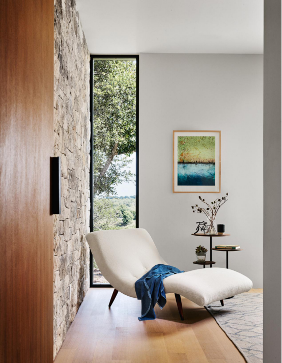 客廳設(shè)有雙高天花板和超大的落地窗,閑坐在客廳內(nèi),欣賞大自然的鬼斧神工和一望無際的天際線。柔軟的灰色內(nèi)飾,手工編織的地毯和豐富的皮革與室內(nèi)裝飾相得益彰,營造出一種輕松宜人的氛圍,俯瞰鄉(xiāng)村風(fēng)光。