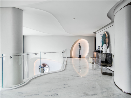 裝飾、扶手、天花、墻壁皆是曲線形態(tài),曲線取之于海浪形態(tài),或翻騰、或平靜。以大理石做白色沙灘,供海浪肆意翻涌。